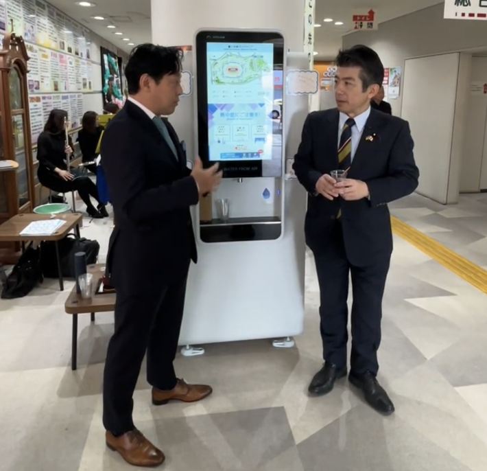 令和8年3月28日、西尾市総合福祉センター(愛知県西尾市 花の木町2-1)の一部リニューアルオープンイベントにて、株式会社アクアム(東京都渋谷区、代表取締役 河﨑悠有)の空気製水機、AQ-60Vのお披露目を行いました。 これは今後の導入に向けた実証実験として常設設置されたものです。当日は市民の皆さまに親しんでいただくため、空気製水機の体験・クイズ・空気からつくった水で入れた抹茶やコーヒーを提供しました。
